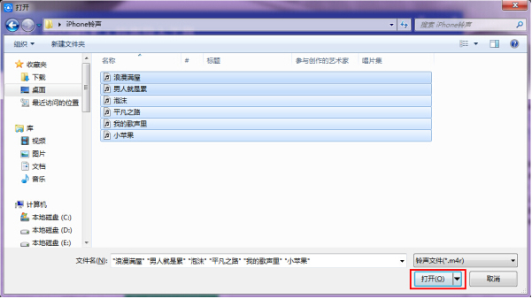 4、找到自己在电脑中下载的iPhone铃声(必须是iPhone铃声的格式,后缀为.m4r),选择之后点击打开即可自动导入到手机中。