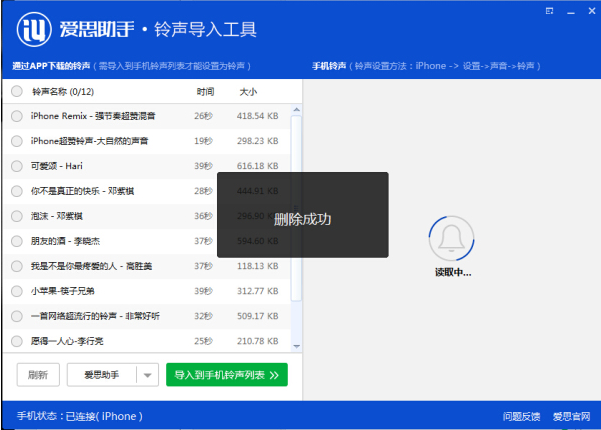 用数据线将iPhone与电脑连接,打开爱思助手铃声导入工具,在右侧“手机铃声”栏选择想要删除的铃声。点击下方“删除手机铃声”即可。