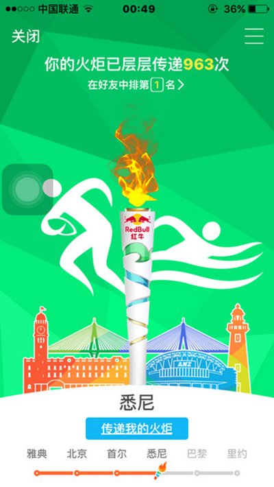 当你成为火炬手,即可点亮雅典,再传递一次火炬,即可点亮北京,获得专属火炬标识。