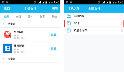 2、击最下方的【 全部( 手机内存卡/SD卡 ) 】选择【 SD卡 】