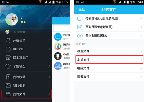 1、首先打开手机QQ后,在左侧点击【 我的文件 】选择【 本机文件 】。
