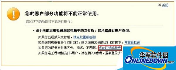 1、如果支付盾丢失、损坏、不匹配,插入支付盾重新检测后还是不能正常使用,可以申请挂失支付盾;点击【点此注销或挂失】;
