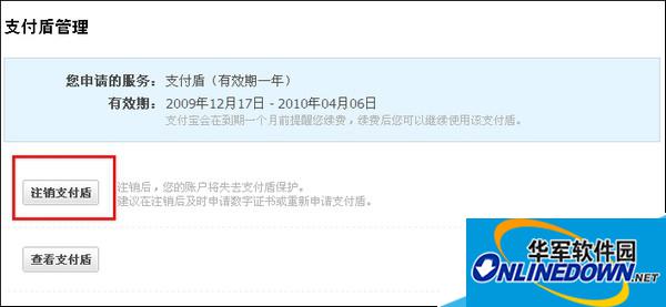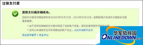 4、支付盾注销成功。支付宝账户将失去支付盾保护,建议在注销后及时申请数字证书或重新申请支付盾。(如何申请支付盾)