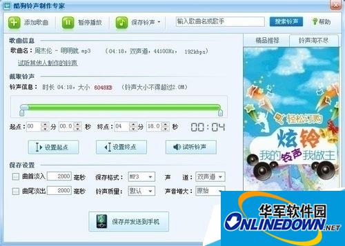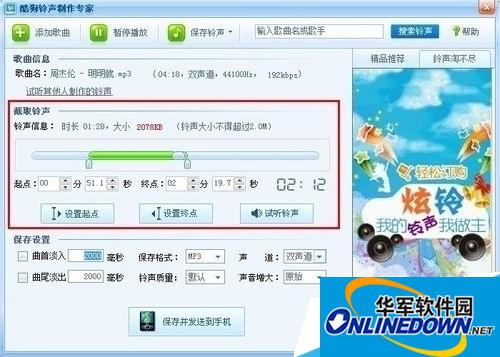 2:如果你还没有安装“铃声制作”工具,软件会自动联网并下载工具,下载完成后会自动运行“铃声制作”工具,如果是从播放列表进入的“铃声制作”,进入后歌曲会自动播放,如果是从“工具”进入,则需要手动添加歌曲