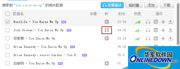 2、找到有MV的资源并且是卡拉ok版mv,点击进入mv后选择伴唱