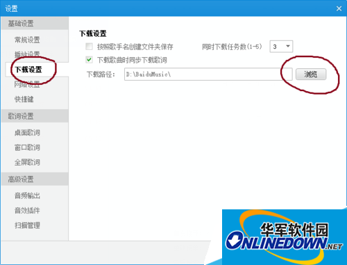 3、点击左边的“下载设置”时,右边出现“下载路径”,接着点击“下载路径”右边的“浏览”按钮。