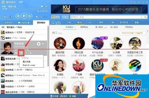 3、在正在播放的电台中有一个加号,指的是收藏到列表。我们点击这个加号,就会跳出下拉菜单。