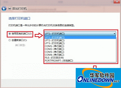 6、选择“使用现有的端口”,选择默认是LPT1端口,点击“下一步”按钮,参见下图