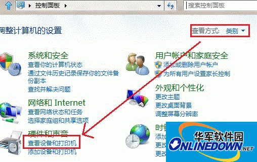 2、打开“控制面板”,选择“查看设备和打印机”,参见下图