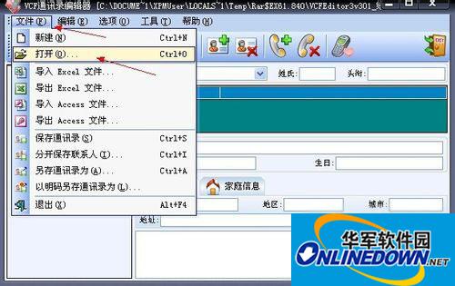 运行VCF通讯录编辑器软件,单击“文件”菜单中的“打开”命令。