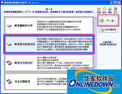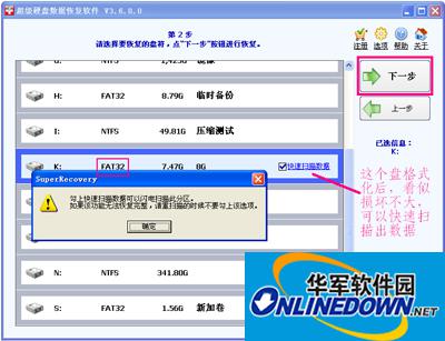 我们运行超级硬盘数据恢复软件后,选“恢复格式化的分区”这个功能来扫描,选择要恢复的盘符,这里是K: 盘,下一步。