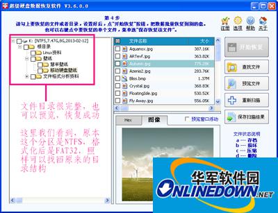 扫描时间很短,一下子就列出目录,里面的文件都可以完整预览,成功恢复。结合上一幅图我们留意到,原本的分区类型是NTFS的,被格式化后成为FAT32的分区,目录文件照样能恢复完整。