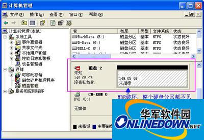 用超级硬盘数据恢复软件可以很方便的恢复出分区表受损后的数据,包括MBR破坏、重新分区、修复坏道后导致分区丢失、在DOS系统下面用 fdisk /mbr 命令清空分区表、在磁盘管理中删除分区等等情况。我们的分区恢复软件一般扫描一个硬盘只需要数分钟就能很彻底的把全部分区扫描出来,各个分区的卷标和根目录文件数据都能正常显示,扫描分区的速度超快,恢复的目录效果也很好。下面以一个160G的移动硬盘为例,介绍下我们软件如何很快的恢复丢失的分区。这个移动硬盘原先有4个分区,包括了NTFS分区和FAT32分区,里面存放了影音图片和工作文件,因为无法安全移除移动硬盘,直接强制拔掉USB接口造成了分区丢失,全部分区都看不到了,硬盘也变成了未指派状态。