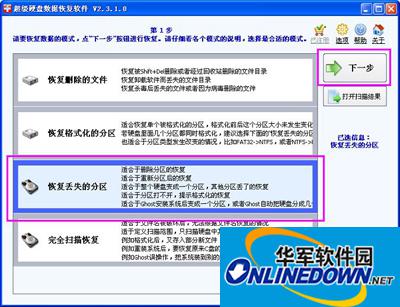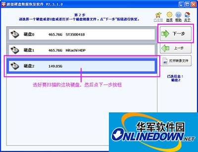 运行超级硬盘数据恢复软件后,我们选第3项,恢复丢失的分区,这个功能最适合这个移动硬盘分区损坏的情况。点下一步后,选择这个移动硬盘“磁盘2”,再点下一步按钮。