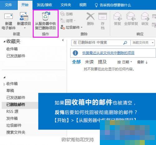 点中【已删除邮件】后,点击开始选项卡下出现的【从服务器中恢复已删除项目】即可出现奇迹。