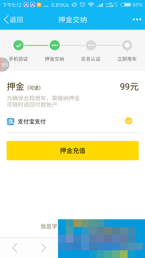 第三步:缴纳99元押金,可选择支付宝和微信支付。(不用了可以随时退款的哦)