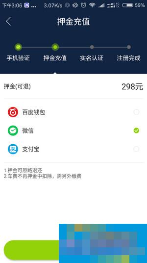 第四步:缴纳298元押金,押金可以在不用的时候随时退还,然后再实名认证即可租车