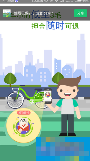缴纳押金298,随时可退,按半小时3毛钱计费,算是最便宜的共享单车。