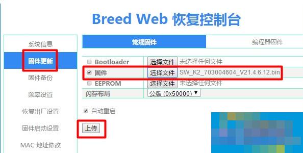 在Breed Web 恢复控制台,点击“固件更新”——>在右侧固件选择后面,点击“选择文件”,然后找到斐讯K2的官方原厂固件——>然后点击“上传”
