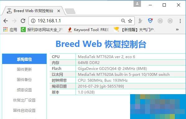 4、在浏览器中输入192.168.1.1,就可以进入到Breed Web控制界面了,如下图所示。