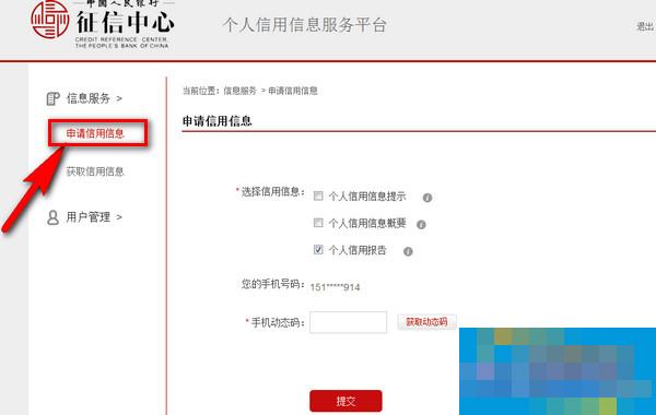 5、完成注册或登陆后,点击“信用服务”下拉的“申请信用信息”,选择个人信用报告。在这里小编说一下,信用信息3个选项,从提示到报告,信用报告是最详细的,建议大家勾选信用报告,并获取手机验证码,提交即可。