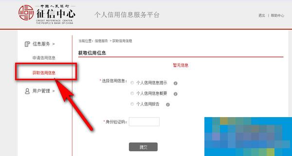 6、提交查询申请后的24小时内将收到手机身份证验证码,用户登录平台,点击"信息服务"—"获取查询结果",输入平台发送到用户手机上的身份验证码,查看选择的信用信息产品,即可成功的查看自己的详细个人征信。