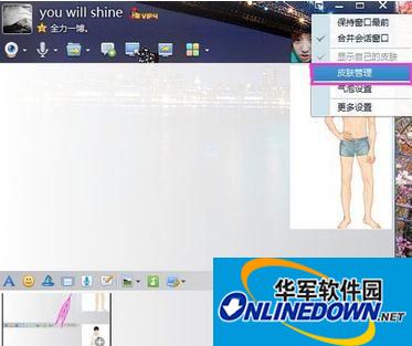 2点击后选择选择“皮肤管理”,当然也可以直接在qq主面板上直接选择“皮肤管理”,只是这样方便看聊天窗口的设置的背景!