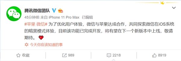 腾讯微信团队方面表示,为了优化用户体验,微信与苹果公司达成合作,共同探索微信在iOS系统的暗黑模式体验,目前该功能已经完成开发,将有望在下一版本中上线,敬请期待。