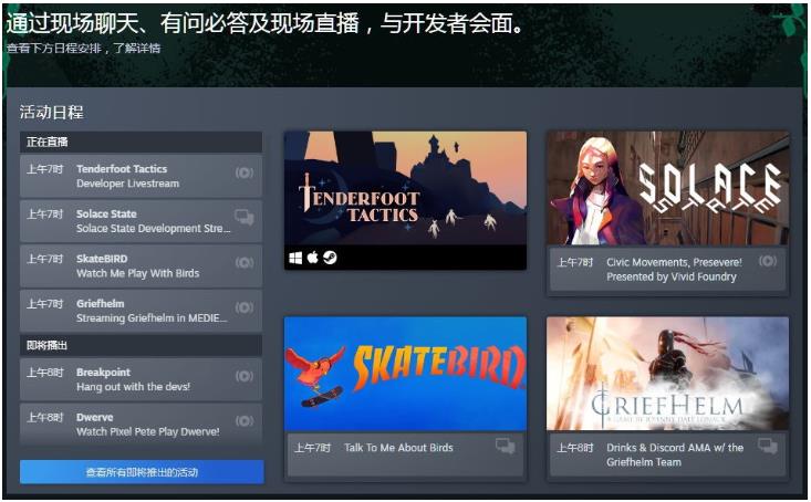 Steam 游戏节夏季版主要聚焦于独立游戏,此外,还提供了开发者访谈与直播交流活动,玩家可以通过现场聊天、有问必答及现场直播,与开发者会面。此次活动将于北京时间 6 月 23 日凌晨 1 点结束。