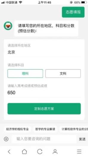 “搜狗高考志愿君”的使用方法非常简单。考生在搜狗搜索APP中输入关键词“高考志愿填报”,即可在搜索结果中看到该工具。这时,考生只需在根据自身实际情况选择“城市”、“科目”,再输入高考分数或预估分数就能进入“搜狗高考志愿君”的对话页面,获得“定制志愿填报建议”。