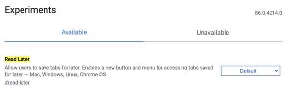 该功能已经上线 Chrome 86 Canary 版本,该功能 “允许用户保存标签页以备日后使用。启用一个新的按钮和菜单,用于访问保存到以后的标签页。”然而,当外媒试图在 macOS 上激活该功能时,却发现没有任何 UI 变化,看来这个功能还处于非常早期的阶段。