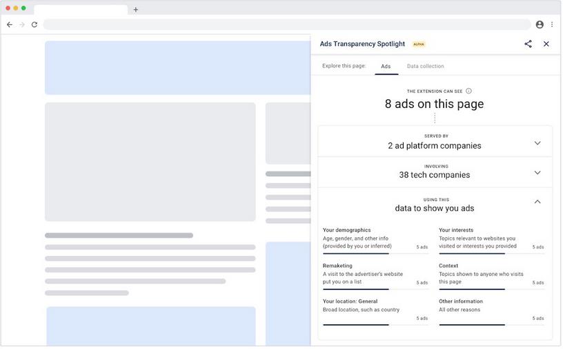 谷歌称,该拓展可以向用户展示那些基于 Google 广告生态机制的广告数量、来源(提供商)、投放广告的原因(位置、喜好、年龄、性别等)等信息。