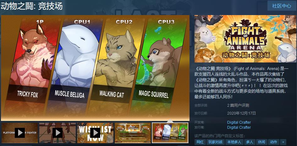 大乱斗游戏《动物之鬪:竞技场》现已在Steam平台发售,国区开启首周特惠,折后价45元,支持中文。