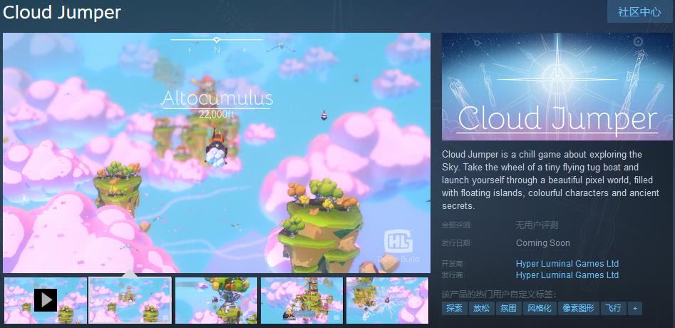 据游戏官方消息,氛围向冒险探索游戏《云间跃动者(Cloud Jumper)》已经上架Steam商城,暂不支持简体中文。