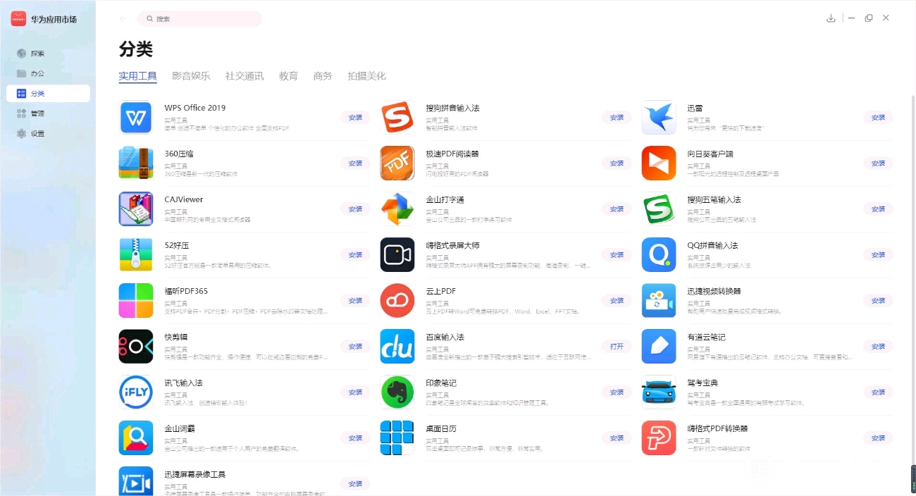 华为应用市场 PC 版分为 “探索”“办公”“分类”“管理”和 “设置”五大栏目。