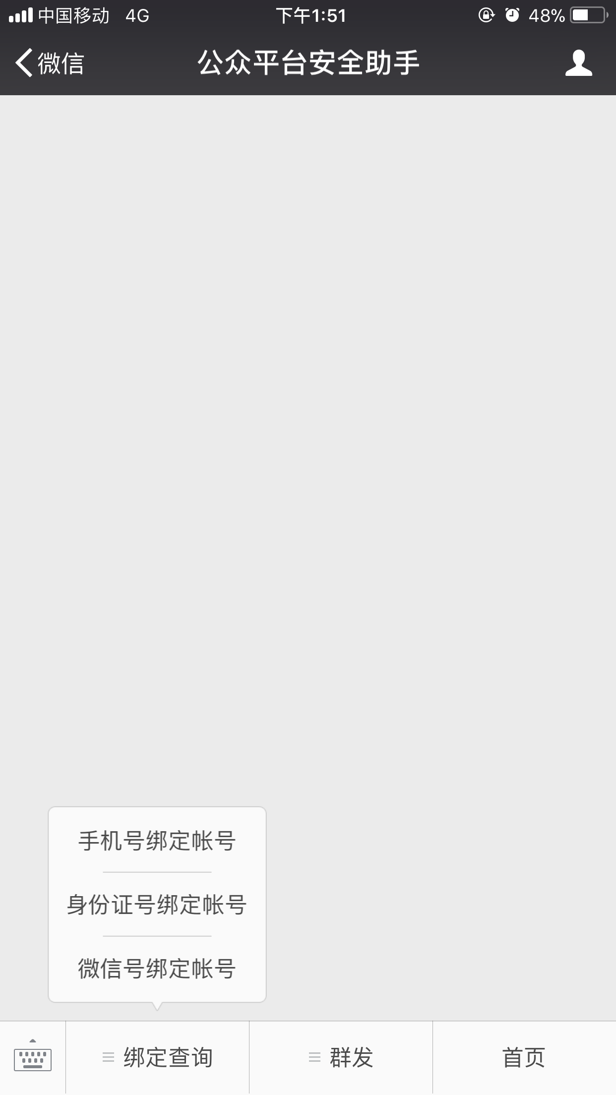首先,在微信中打开"公众平台安全助手",在左下角菜单里有一个“绑定查询”选项。
