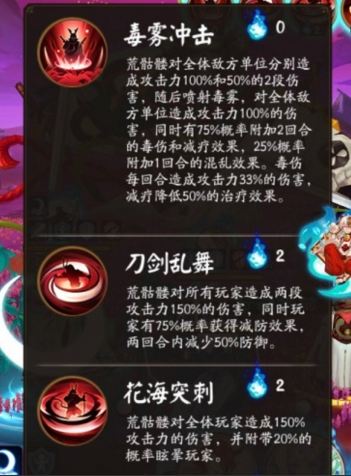 荒骷髅对全体敌方单位分别造成攻击力100%、50%、的2段伤害,随后喷射毒雾,对全体敌方 单位造成攻击力100%的伤害,同时有75%的概率附加2回合的毒伤和减疗效果。25%的概率附加1回合的混乱效果。毒伤每回合造成攻击力300%的伤害,减疗降低50%的治疗效果
