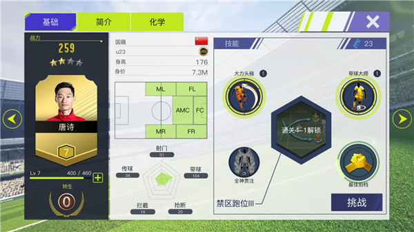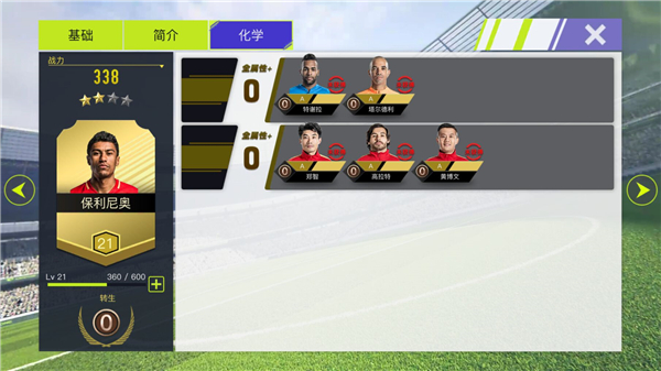 每个球员的化学反应也很重要,所有A级以上的球员均拥有多套化学,具体就是跟特定球员一起上场时,会有额外的加成效果。后续尤其是打竞技场PVP的时候,考虑化学反应往往是组建一个球队的关键哦。