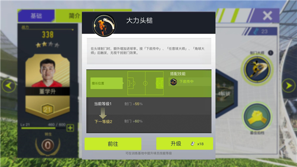 中期考虑技能的配合,球员董学升的身高比较出众,而自身又有大力头槌的技能,而这技能需要接下底传中、任意球大师或角球大师才能触发,拥有这类技能的选手,才能发挥董学升大力头锤的威力。