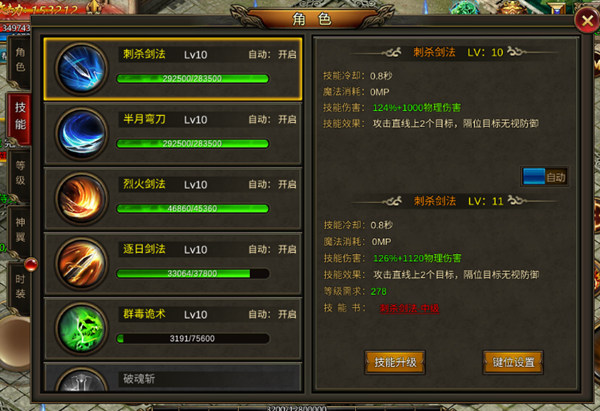 每个技能均有技能等级,需要通过使用技能书或者杀怪,累积熟练。