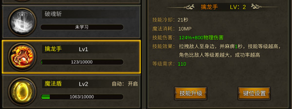 擒龙手:拉拽敌人至身边,并麻痹数秒,技能等级越高,角色比敌人等级差越大,成功率越高。并且物理伤害也会得到提高。
