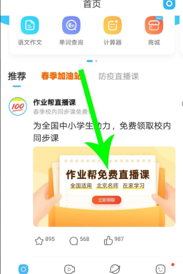 打开作业帮首页向下滑动,然后点击“作业帮免费直播课”图片。