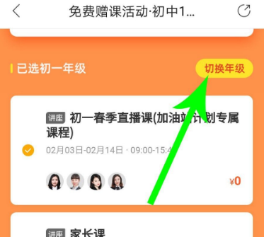 打开春季免费直播课界面向下滑动,然后点击“切换年级”,接着点选“年级”。