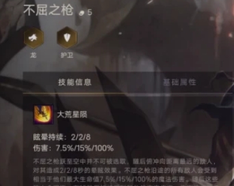 技能来说,不屈之枪是个群体眩晕的控制,伤害是敌方最大生命值的一定百分比,还会附加上重伤的效果,造成额外的真实伤害。
