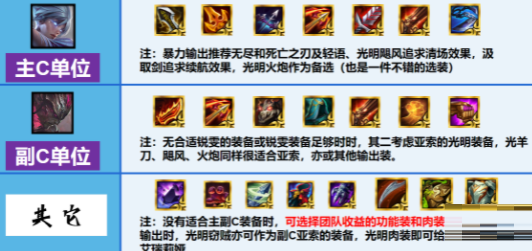 优先找锐雯的物理输出装备,后续找亚索装备(法强、攻速)