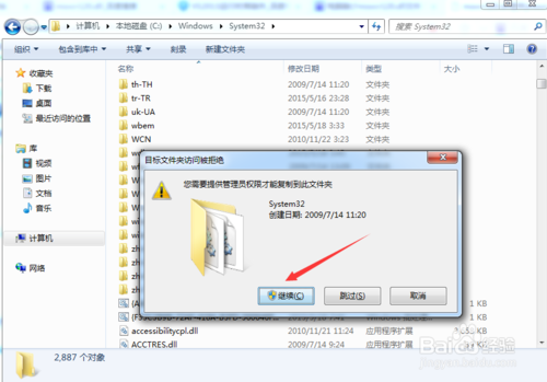 第二步:然后我们将MSVCR120.dll复制,然后进入我的电脑->windows->System32,再点击粘贴。这个时候会提示你是否继续,我们点击继续(如图所示)。