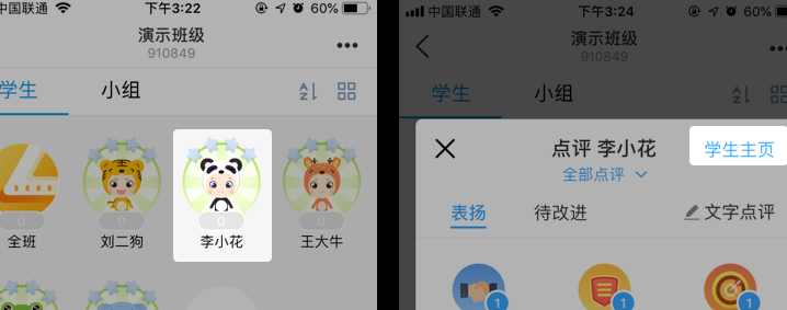 在点评页面下,点击学生姓名右侧的【学生主页】