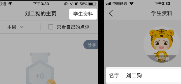 点击学生主页右上角的【学生资料】进入到姓名编辑页面,即可编辑学生姓名。
