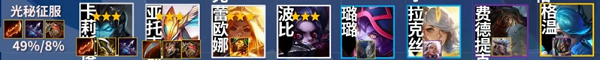光秘征服阵容的全称叫做光明守护者,加上秘术法师,最后再加上征服者这三个羁绊来组成,具体的角色有三费卡牌卡莉斯塔,三费卡牌亚托克斯,三费卡牌雷欧娜,三费卡牌波比,一费卡牌璐璐,一费卡牌拉克丝,一费卡牌费德提克,五费卡牌格温。