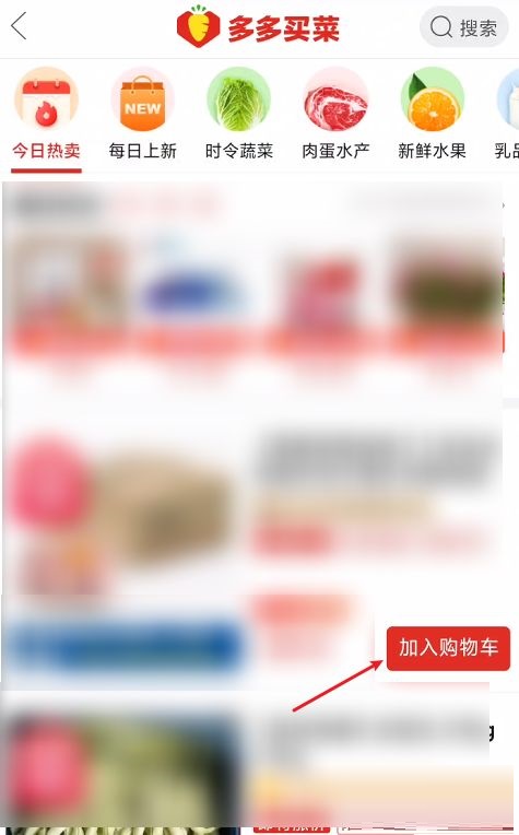 第三步:进入多多买菜页面,把需要购买的菜加入购物车(如图所示)。